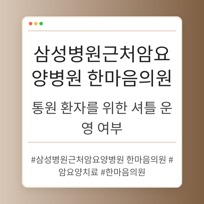 삼성병원 근처의 암 요양 병원 선택 시 통원 환자를 위한 셔틀 운영 여부는 중요한 판단 기준입니다. 한마음의원은 고객의 편의를 고려한